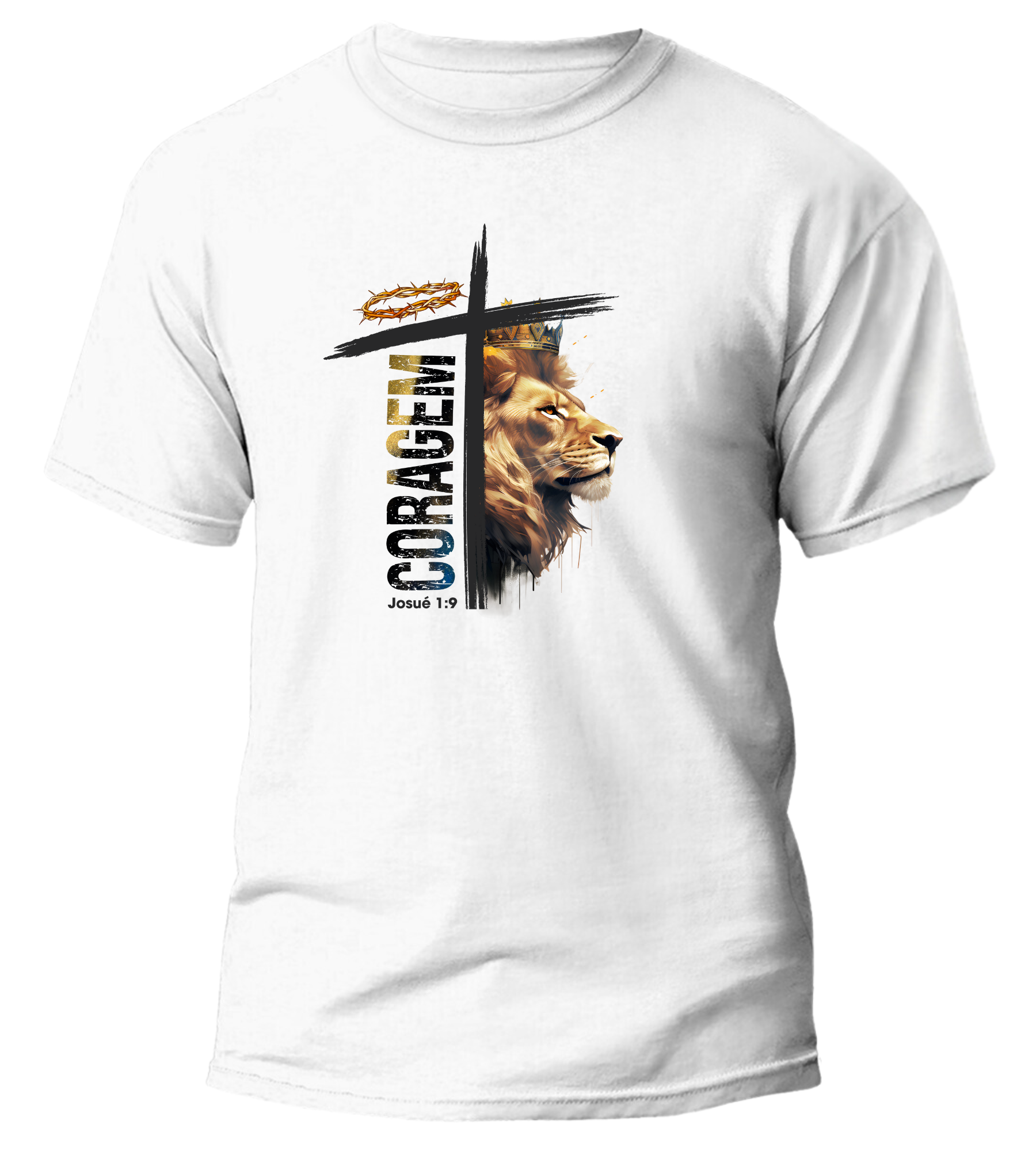 Renove seu guarda-roupa com nossa incrível camiseta Coragem Cruz Coroa Leão! Esta peça unissex é perfeita para expressar sua fé com estilo e conforto.